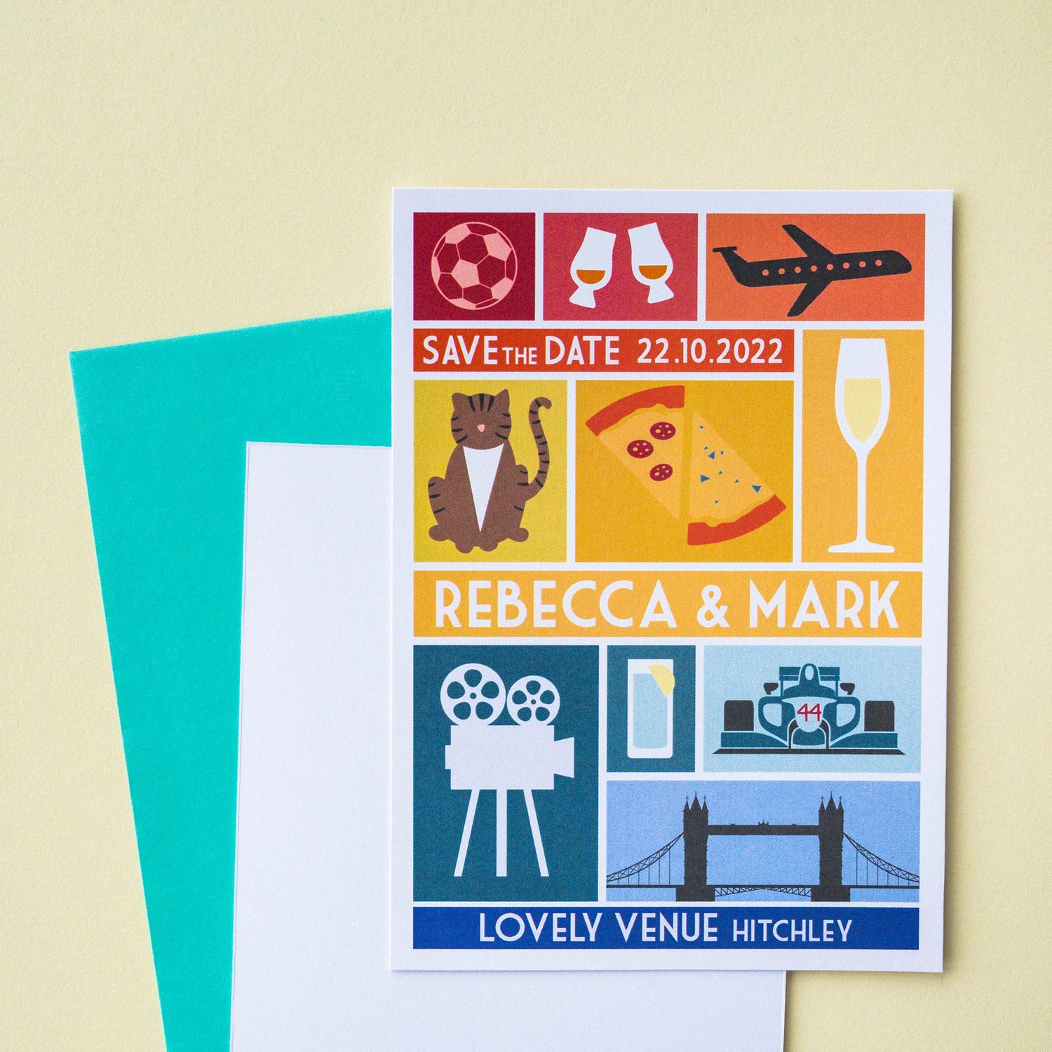 This design is inspired by the artwork of Wes Anderson and that every couple is unique.